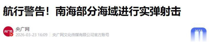 央广网——飘扬告戒!南海部分海域进行实弹射击——2026年3月23日