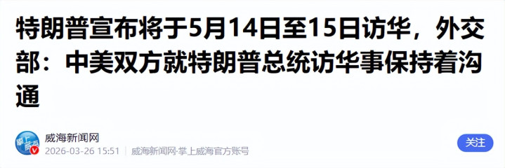 1.《特朗普通知将于5月14日至15日访华,酬酢部:中好意思两边就特朗普总统访华事保持着换取》2026-03-26 15:51 | 开头:威海新闻网