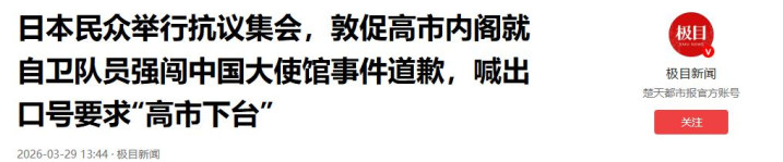 在近日,又名自称“日本自保队东说念主员”的犯罪之徒翻墙强行闯入中国驻日大使馆,挟制杀害中海酬酢东说念主员。暴徒在被制服之后,对其刺杀企图供认不讳。为此,中国驻日大使馆提倡严正交涉并示意激烈抗议,条款日方作出负背负的布置。但是,扫尾现时,日本政府方面仅示意“缺憾”,并未说起说念歉或具体问责形状。很彰着,高市政府企图将这起恶性酬酢事件“小事化了”,不仅中国不应允,日本环球也挣扎。因此,侵馆第5天,“高市离职”传遍东京!