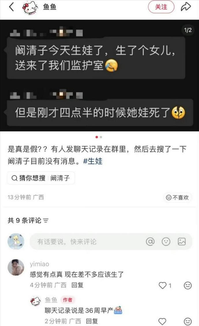 在截图中,网友默示阚清子本日在上海随和家病院生了个男儿,可是四点半的时代孩子短寿了。