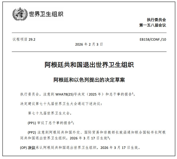 本年2月3日,宇宙卫生组织决定草案清爽,承认阿根廷共和国退出宇宙卫生组织,2026年3月17日成效。