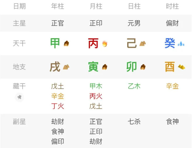 我们再来合座的看下这个八字,你就会发现,其中每个字王人在干活:官星甲木在干活,化癸水护丙火,不让财星坏印;印星丙火在干活,看住食伤,生扶日主,稳住整个口头。
