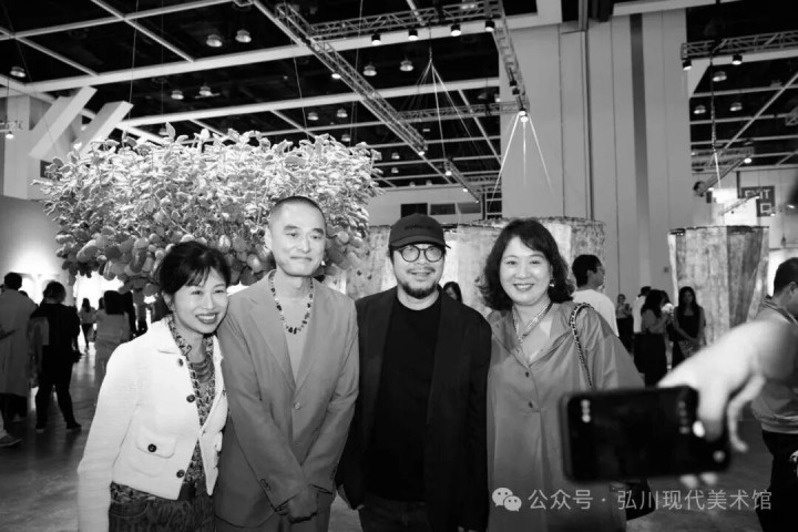 肖戈、冯唐和参展艺术家桑火尧、弘川现代艺术博物馆馆长李国红合影,桑火尧两件作品每件以77000好意思元首日售出。影相:姜雨达