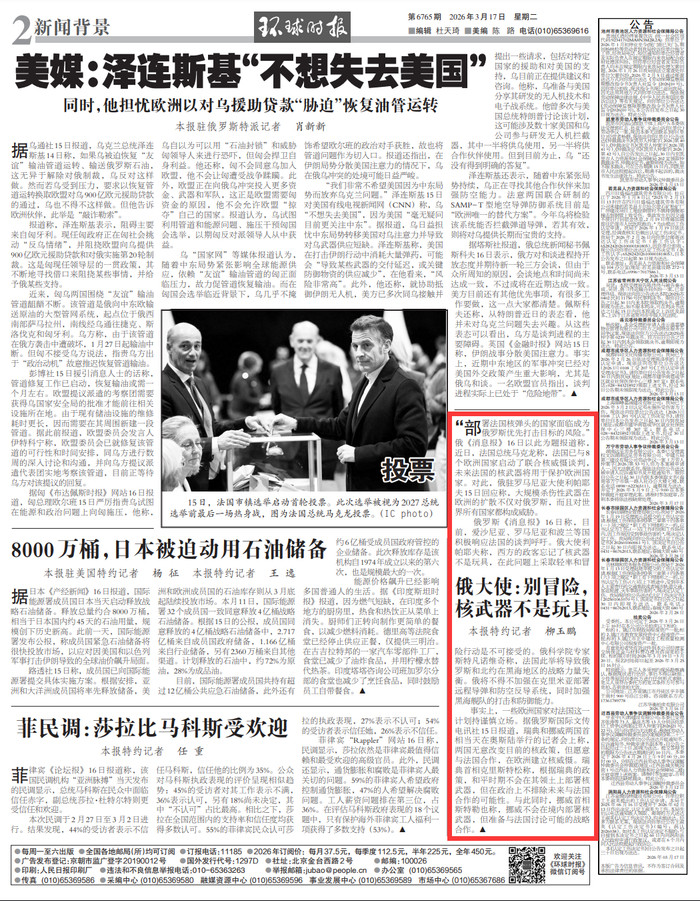 “部署法国核弹头的国度面对成为俄罗斯优先打击办法的风险。”俄《音尘报》16日以此为题报谈称,近日,法国总统马克龙称,法国已与8个欧洲国度开动了麇集核威慑酌量,畴前法国的核兵器将用于保护欧洲国度。对此,俄驻罗马尼亚大使利帕耶夫15日恢复称,大规模杀伤性兵器在欧洲的扩散不仅对俄罗斯,而况对寰宇系数国度王人组成胁迫。