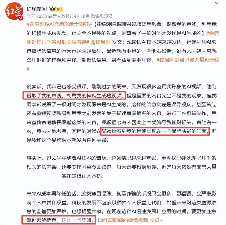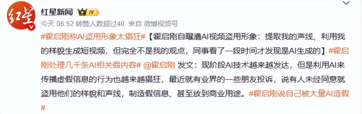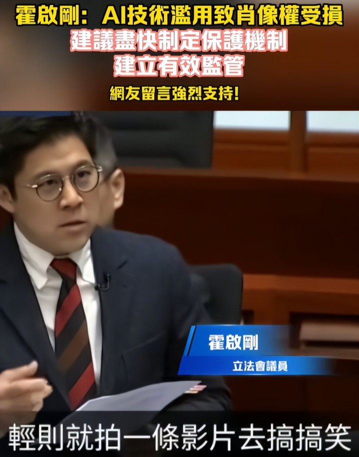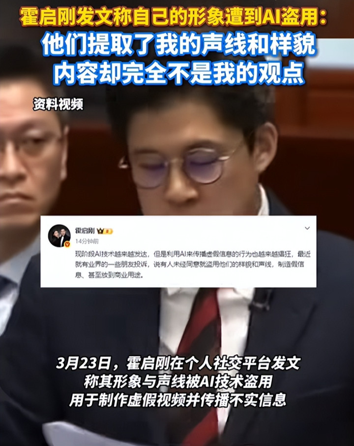 继甄子丹、全红婵等东说念主被AI侵袭后,一向低调千里稳的霍启刚,也未能避免。