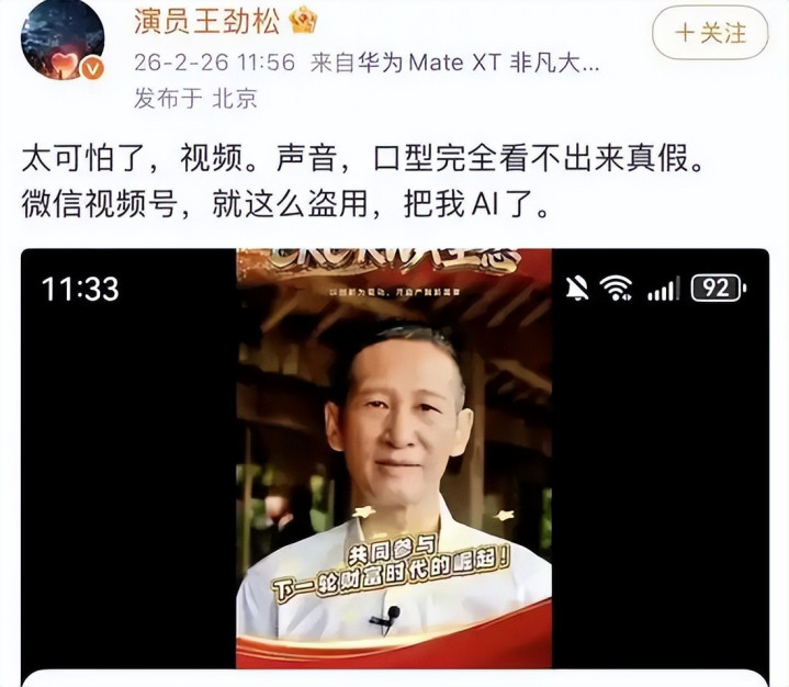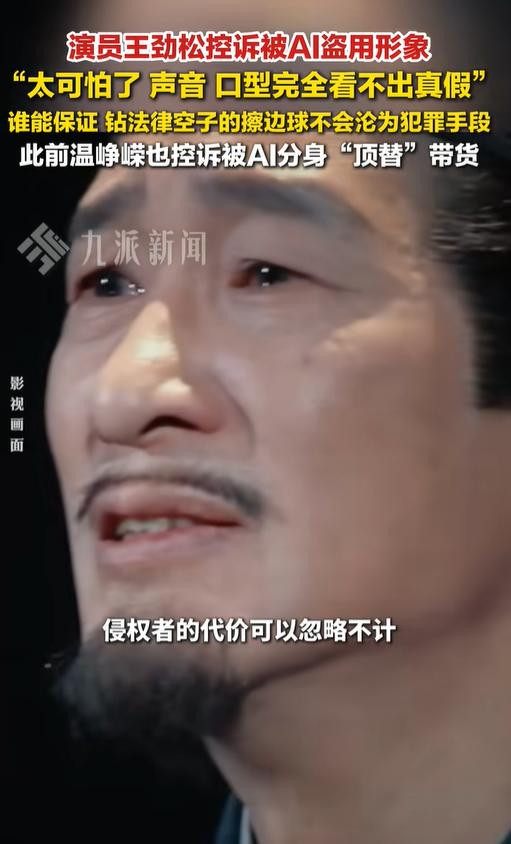本年2月,演员王劲松曾发文控诉,我方的形象被AI盗用生成视频。