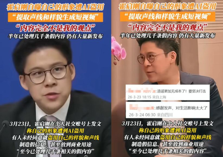 3月23日,霍启刚发文自曝深陷AI盗用的窘境。