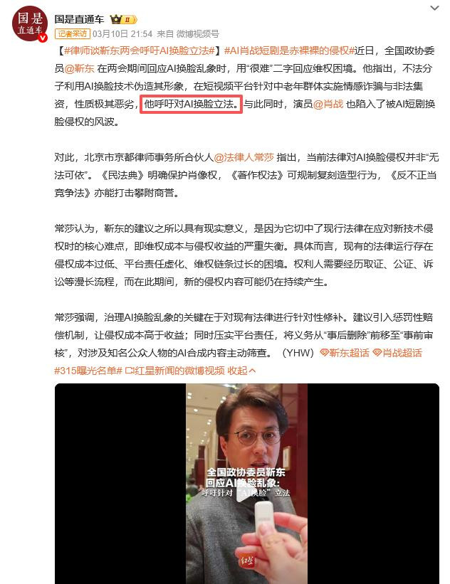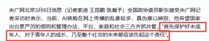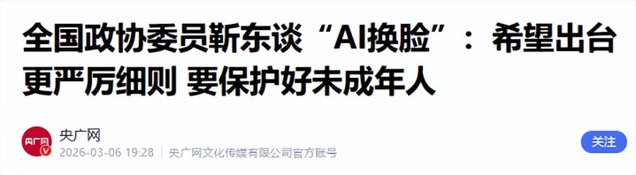 央广网|寰球政协委员靳东谈“AI换脸”:但愿出台更严厉细目 要保护好未成年东说念主